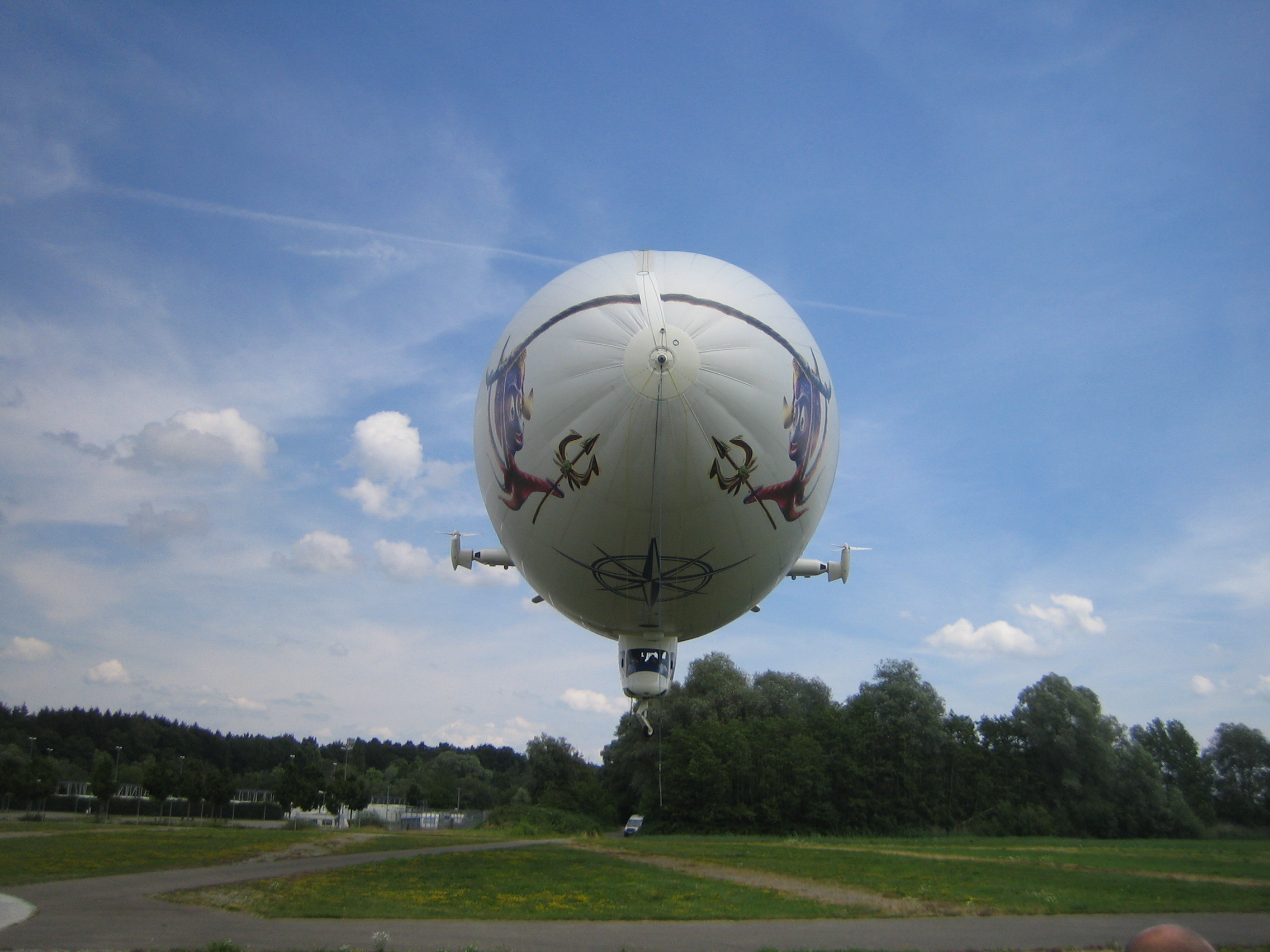Zeppelin NT beim Landeanflug auf dem Rollfeld in Friedrichshafen. (rechts/links eigene Aufn. Flugplatz Friedrichshafen 2019).